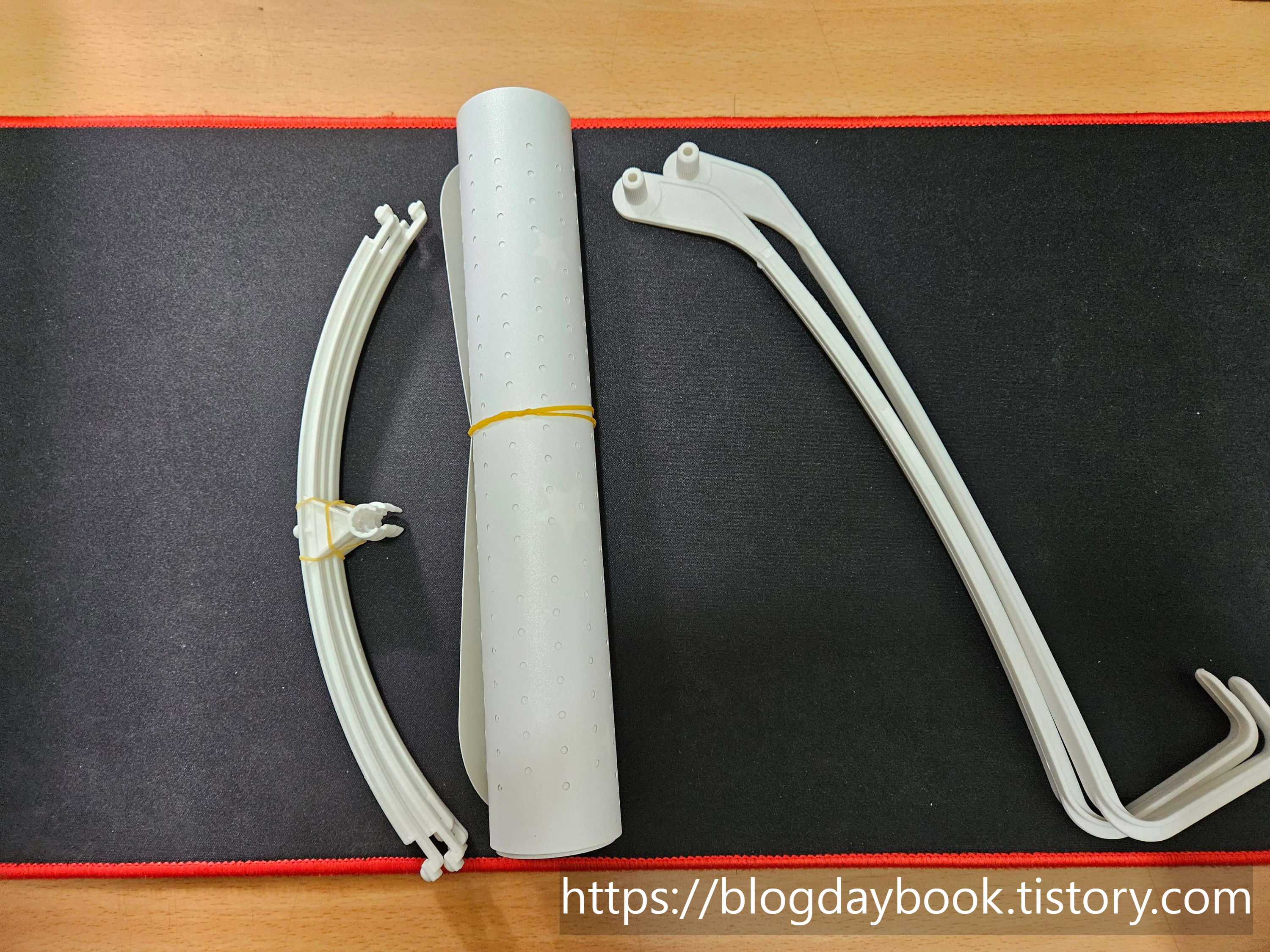 1. 바람막이 양 끝의 홀에 지지대의 양쪽 끝을 끼우고 마지막에 중간의 홀에 맞춰서 고정시켜 주십시오.